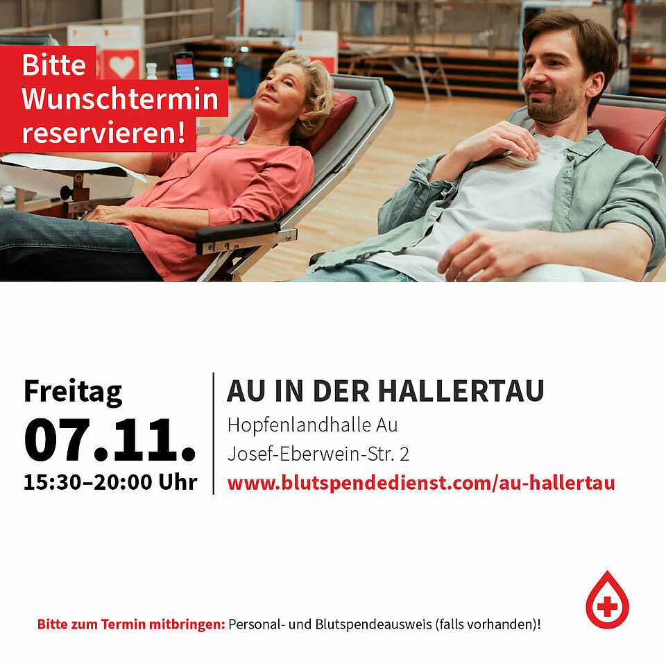 Termin Blutspende Au in der Hallertau 07.11.2025